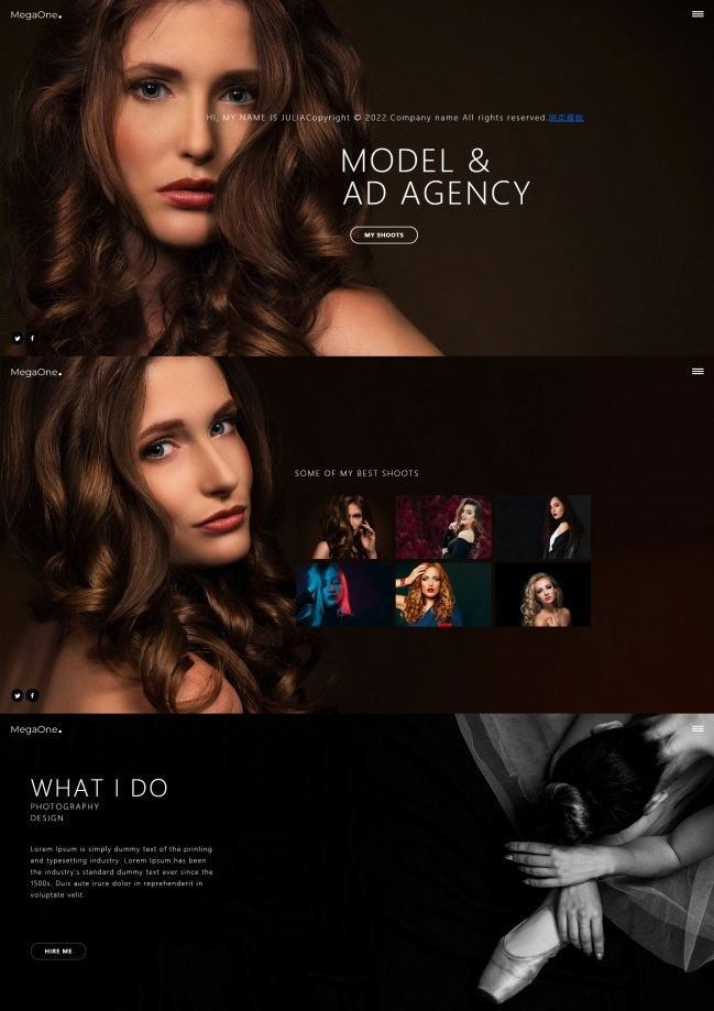 模特广告代理个人简历网页模板是一款模特、广告代理等职业岗位个人简历展示网页模板下载。提示:本模板调用到谷歌字体库,可能会出现页面打开比较缓慢。